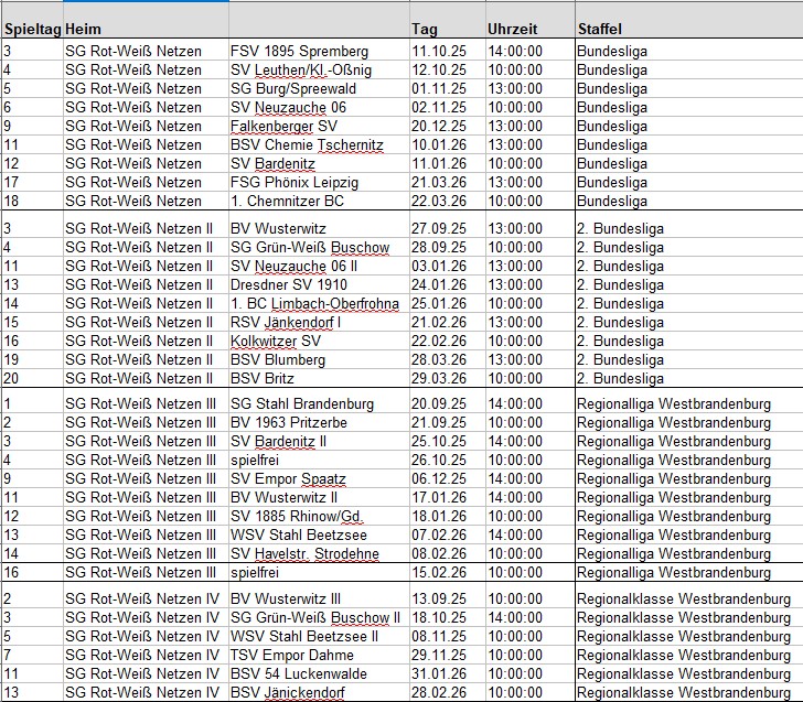 Unser Sportverein SG Rot-Weiss Netzen e.V. bietet Training und Spielbetrieb für folgende Sportarten an: